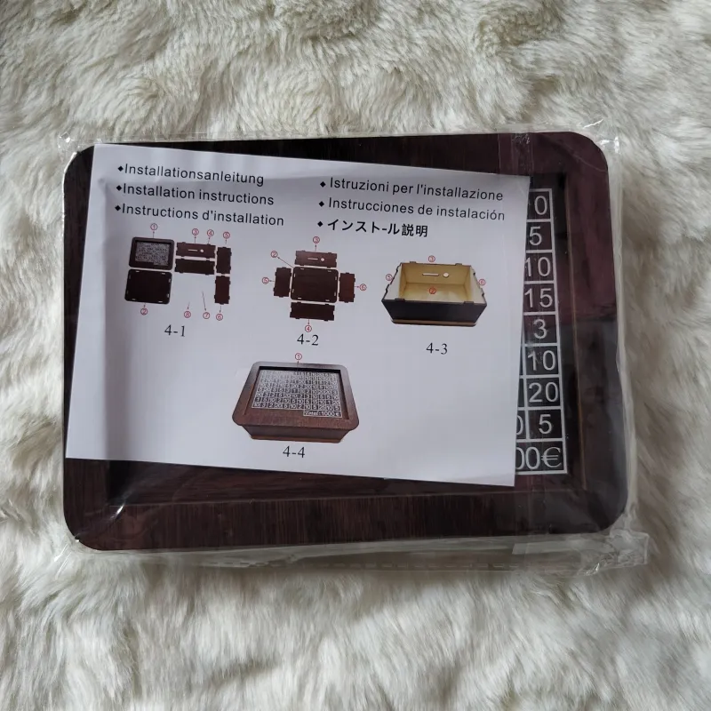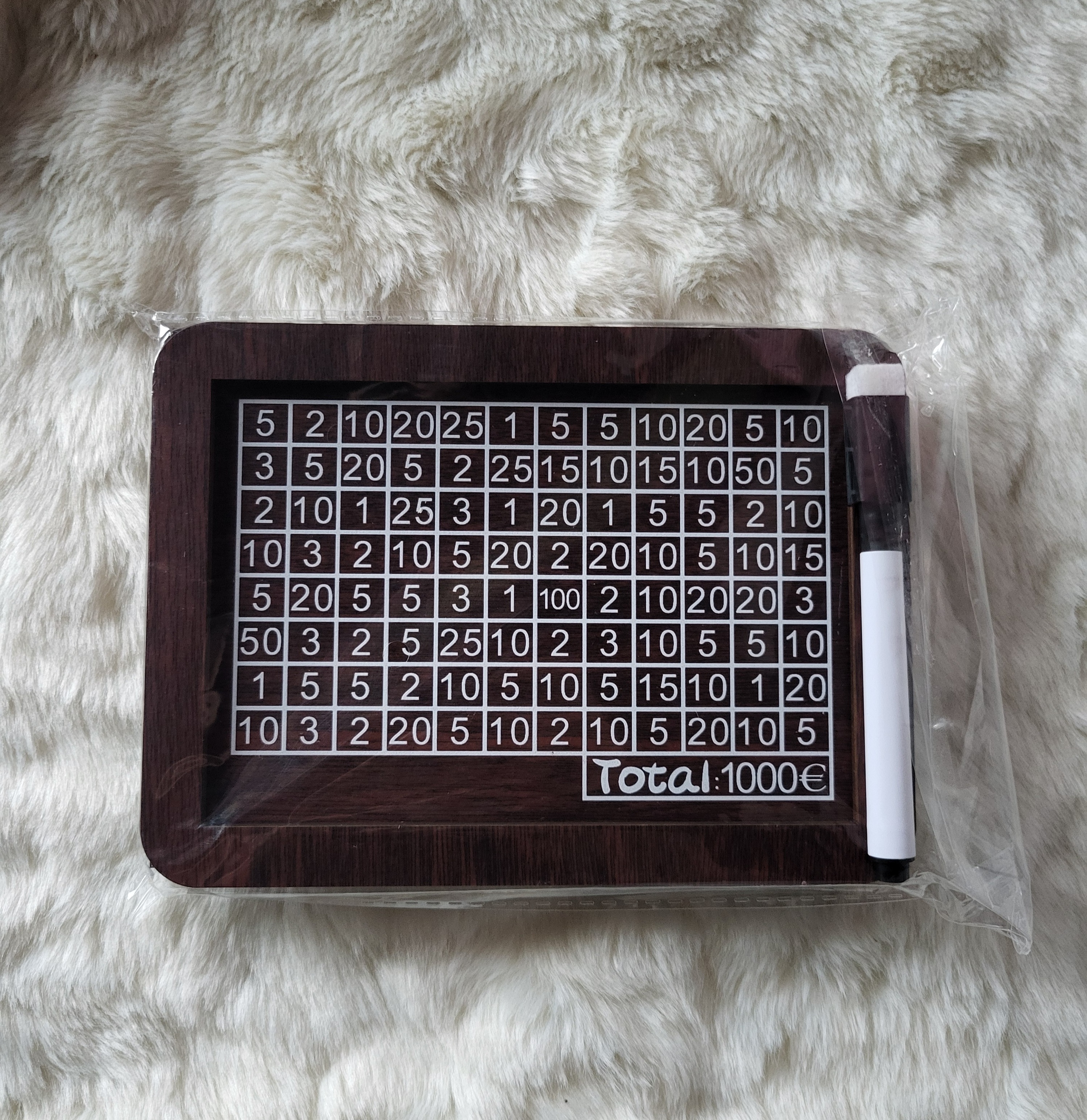 Medinė taupyklė. Įdėjus pinigus reikia pažymėti įdėtą sumą ir užbrautki skaičių. Kai užbraukiami visi lentelės skaičiai, vadinasi taupyklėje bus surinkta 1000 €. Taupyklė lengvai susirenka.