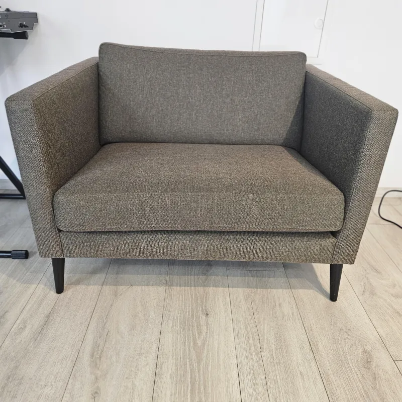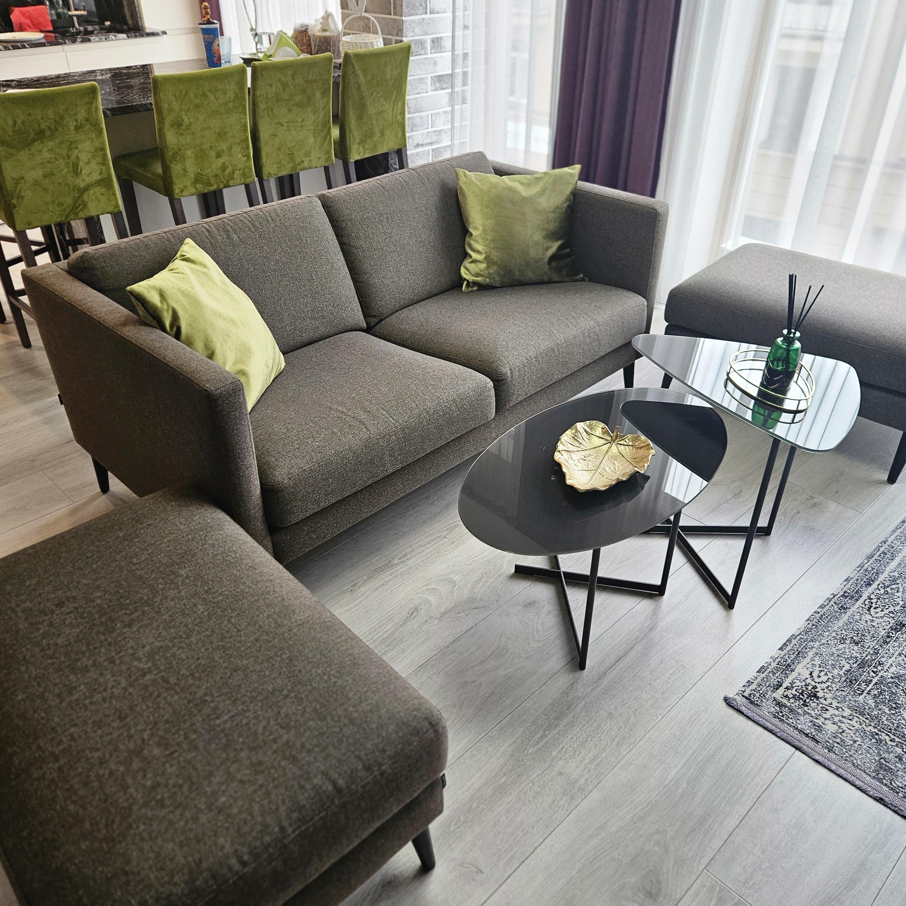Parduodu minkštą komplektą: sofą, du pufus ir krėslą. Baldai labai geros būklės, naudoti tik metus laiko. Parduodu už 700 EUR. Kaina derinama.