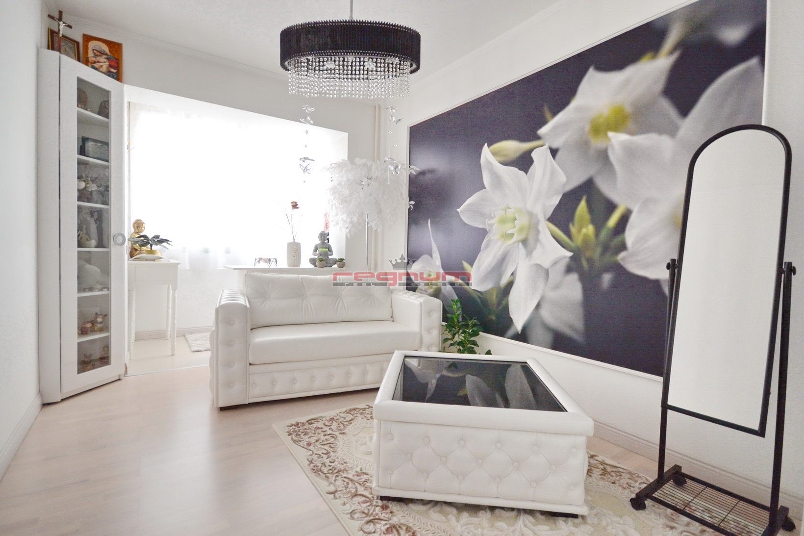 Baltas odinis komplektas su miegamuoju mehanizmu-sofa ir stalas kaina 1300.