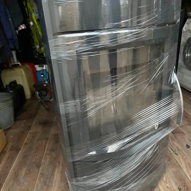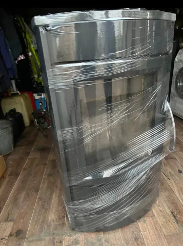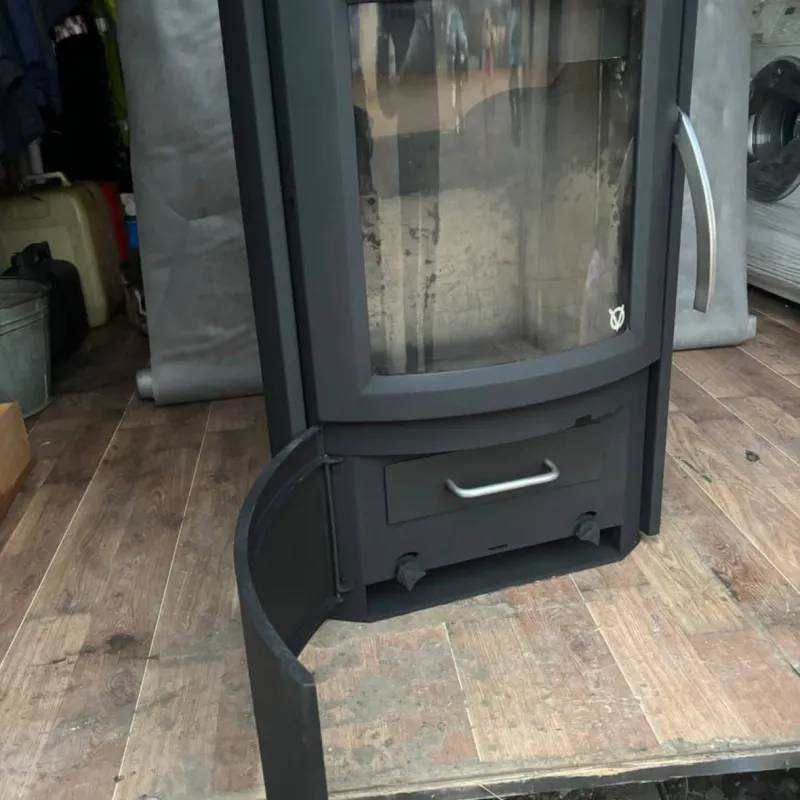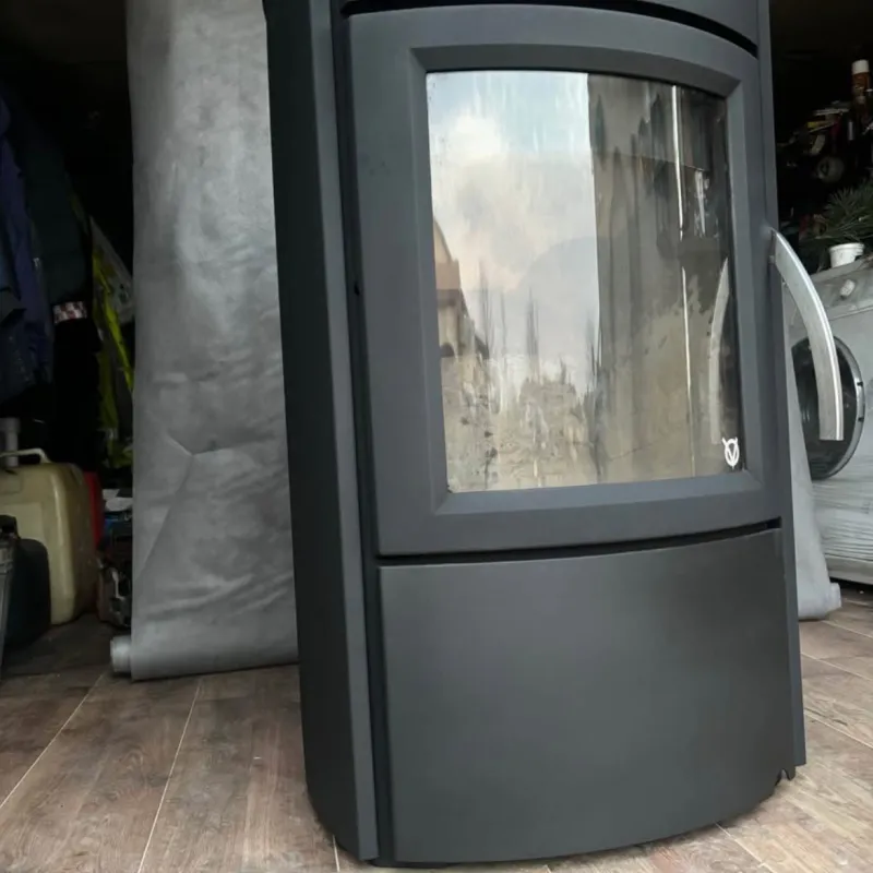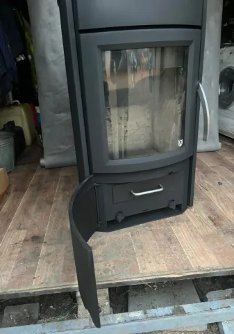 Parduodama išvaizdi, masyvi Skandinaviška krosnelė, didelė pakura, didelis panoraminis stiklas, antrinis degimas. Kamino pajungimas iš viršaus, arba iš galo. Graži akmens apdaila.