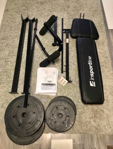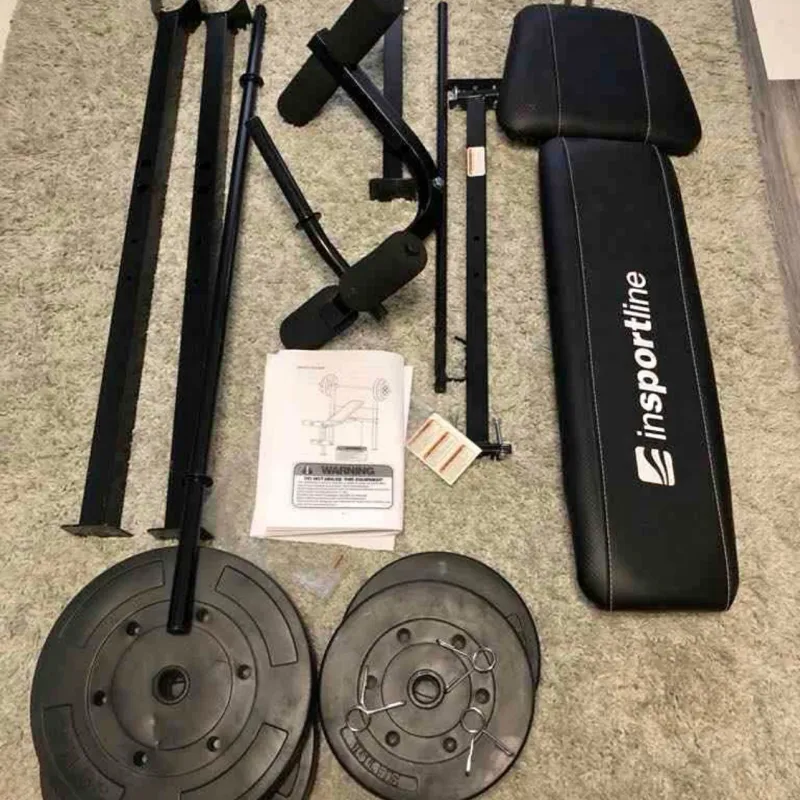 Treniruočių suolelis su 4 ,,blynais,, viso 55 kg. Buvo surinktas bet nenaudotas, skirtas viršutinės kūno dalies ir kojų treniravimui.