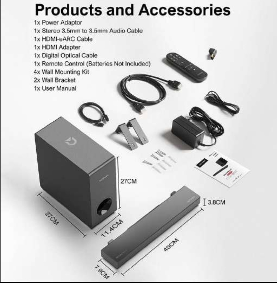 Ryšiai: HDMI eARC, optinis, AUX, USB, Bluetooth 5.3