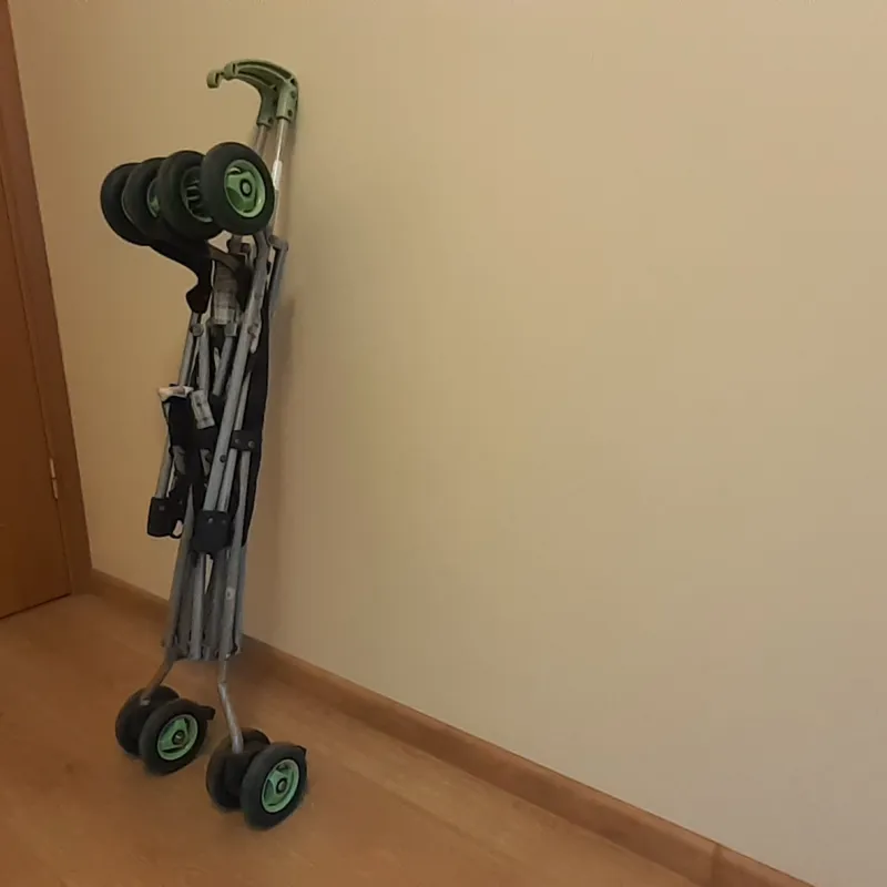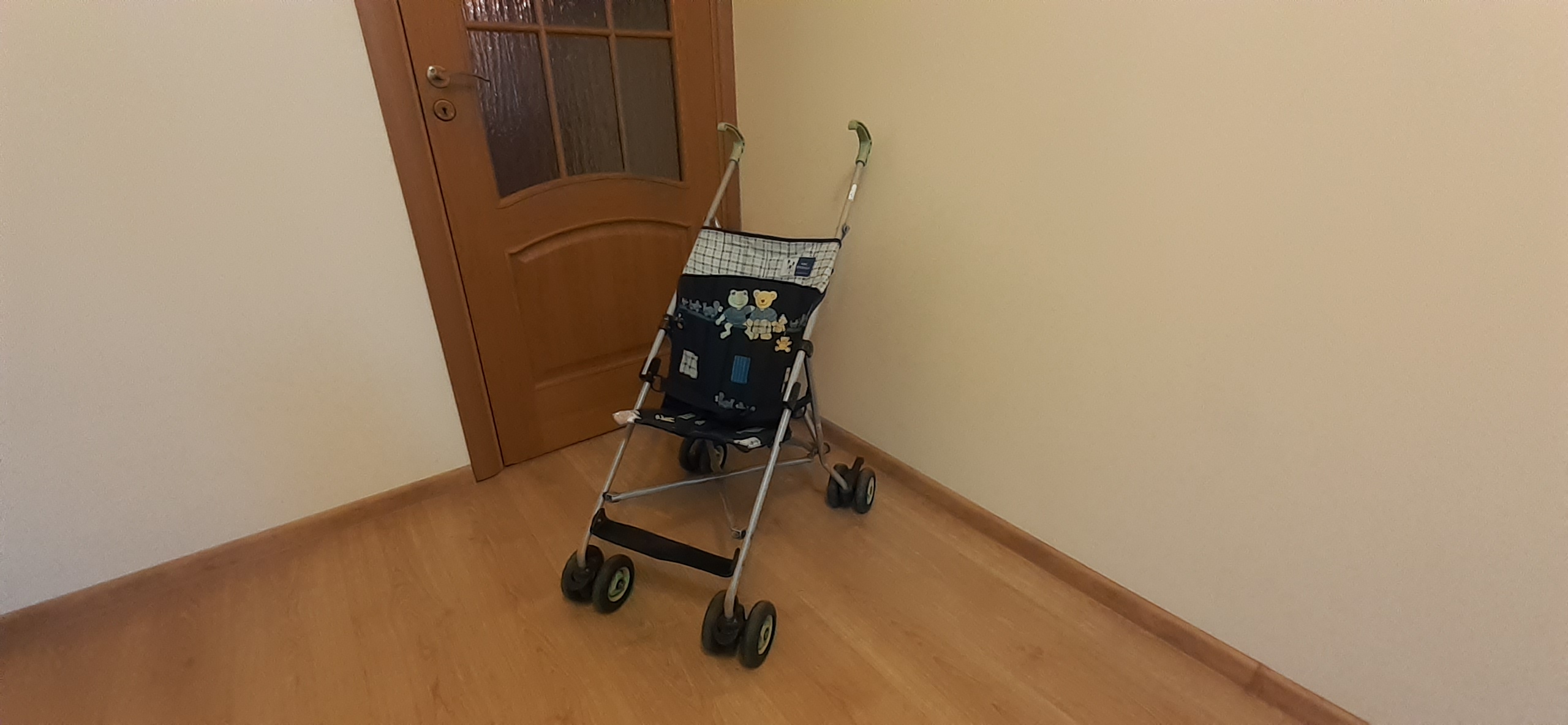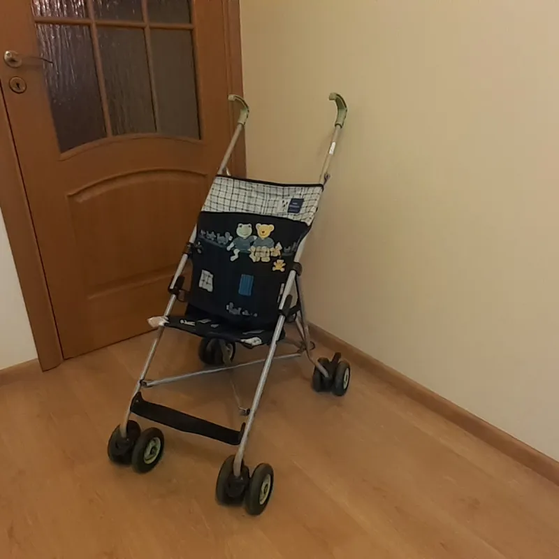 Vieno vaiko naudotas, sulankstomas kaip skėtukas, vežimėlis.